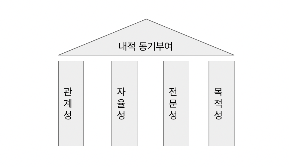 오늘은 외적 동기부여와 내적 동기부여에 대해서 알아보았어요. 그리고 내적 동기부여를 이루는 관계성, 자율성, 전문성, 목적성 4개의 기둥을 통해 번아웃을 판단하는 방법을 설명드렸어요. 이것은 나 자신의 내적 동기부여를 위해 사용할 수도 있지만 리더가 된다면 내 팀의 동료들에게도 사용할 수 있어요. 나의 팀의 관계성이 어떤지, 자율성은 충분한지, 전문성이 있는 도전적인 업무를 주고 있는지, 목적성을 잘 인지하도록 돕고 있는지를 확인하며 팀을 이끄는 리더가 된다면 좋은 리더가 되지 않을까 싶어요.